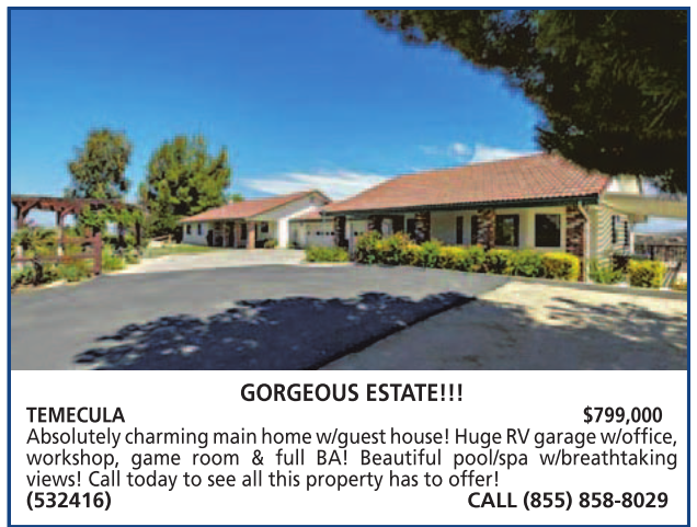 GORGEOUS ESTATE!!! TEMECULA $799,000 Absolutely charming main home w/guest house! Huge RV garage w/office, workshop, game room & full BA! Beautiful pool/spa w/breathtaking views! Call today to see all this property has to offer! (532416) CALL (855) 858-8029