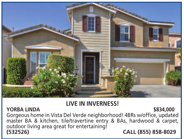 LIVE IN INVERNESS! YORBA LINDA $834,000 Gorgeous home in Vista Del Verde neighborhood! 4BRs w/office, updated master BA & kitchen, tile/travertine entry & BAs, hardwood & carpet, outdoor living area great for entertaining! (532526) CALL (855) 858-8029
