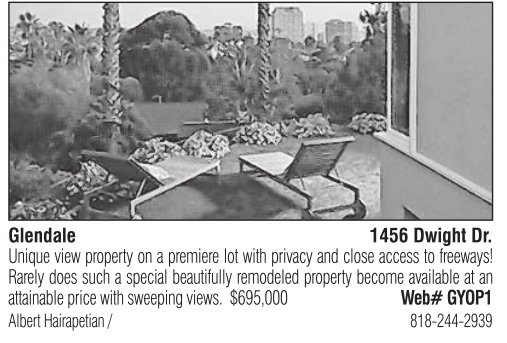 Glendale 1456 Dwight Dr. Unique view property on a premiere lot with privacy and close access to freeways! Rarely does such a special beautifully remodeled property become available at an attainable price with sweeping views. $695,000 Web# GYOP1 Albert Hairapetian / 818-244-2939