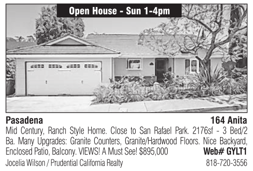 Open House - Sun 1-4pm Pasadena 164 Anita Mid Century, Ranch Style Home. Close to San Rafael Park. 2176sf - 3 Bed/2 Ba. Many Upgrades: Granite Counters, Granite/Hardwood Floors. Nice Backyard, Enclosed Patio, Balcony. VIEWS! A Must See! $895,000 Web# GYLT1 Jocelia Wilson / Prudential California Realty 818-720-3556