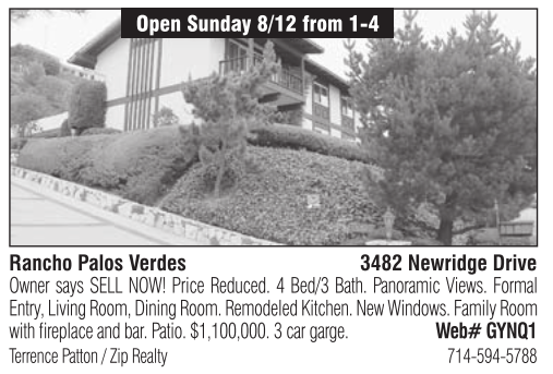 Open Sunday 8/12 from 1-4 Terrence Patton / Zip Realty 714-594-5788 Rancho Palos Verdes 3482 Newridge Drive Owner says SELL NOW! Price Reduced. 4 Bed/3 Bath. Panoramic Views. Formal Entry, Living Room, Dining Room. Remodeled Kitchen. New Windows. Family Room with fireplace and bar. Patio. $1,100,000. 3 car garge. Web# GYNQ1