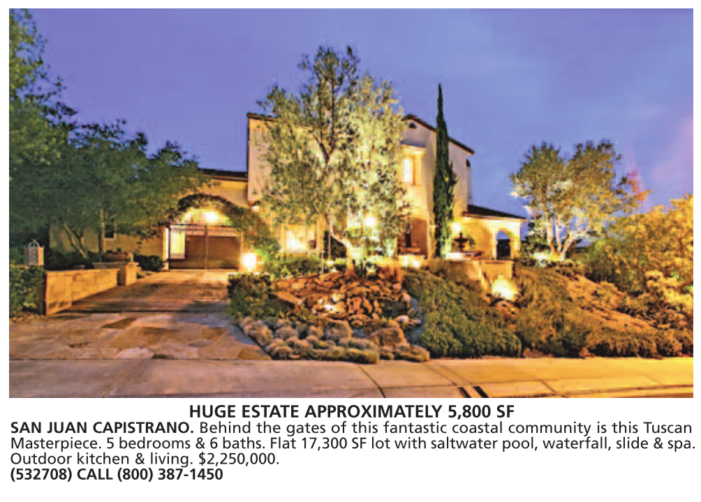 HUGE ESTATE APPROXIMATELY 5,800 SF SAN JUAN CAPISTRANO. Behind the gates of this fantastic coastal community is this Tuscan Masterpiece. 5 bedrooms & 6 baths. Flat 17,300 SF lot with saltwater pool, waterfall, slide & spa. Outdoor kitchen & living. $2,250,000. (532708) CALL (800) 387-1450