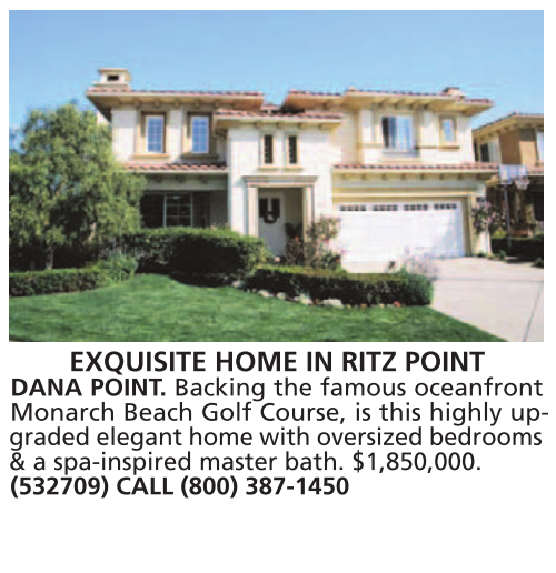 EXQUISITE HOME IN RITZ POINT DANA POINT. Backing the famous oceanfront Monarch Beach Golf Course, is this highly upgraded elegant home with oversized bedrooms & a spa-inspired master bath. $1,850,000.