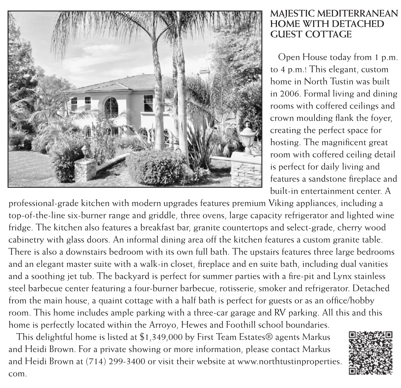 MAJESTIC MEDITERRANEAN HOME WITH DETACHED GUEST COTTAGE Open House today from 1 p.m. to 4 p.m.! This elegant, custom home in North Tustin was built in 2006. Formal living and dining rooms with coffered ceilings and crown moulding fl ank the foyer, creating the perfect space for hosting. The magnifi cent great room with coffered ceiling detail is perfect for daily living and features a sandstone fi replace and built-in entertainment center. A professional-grade kitchen with modern upgrades features premium Viking appliances, including a top-of-the-line six-burner range and griddle, three ovens, large capacity refrigerator and lighted wine fridge. The kitchen also features a breakfast bar, granite countertops and select-grade, cherry wood cabinetry with glass doors. An informal dining area off the kitchen features a custom granite table. There is also a downstairs bedroom with its own full bath. The upstairs features three large bedrooms and an elegant master suite with a walk-in closet, fi replace and en suite bath, including dual vanities and a soothing jet tub. The backyard is perfect for summer parties with a fi re-pit and Lynx stainless steel barbecue center featuring a four-burner barbecue, rotisserie, smoker and refrigerator. Detached from the main house, a quaint cottage with a half bath is perfect for guests or as an offi ce/hobby room. This home includes ample parking with a three-car garage and RV parking. All this and this home is perfectly located within the Arroyo, Hewes and Foothill school boundaries. This delightful home is listed at $1,349,000 by First Team Estates® agents Markus and Heidi Brown. For a private showing or more information, please contact Markus and Heidi Brown at (714) 299-3400 or visit their website at www.northtustinproperties. com.