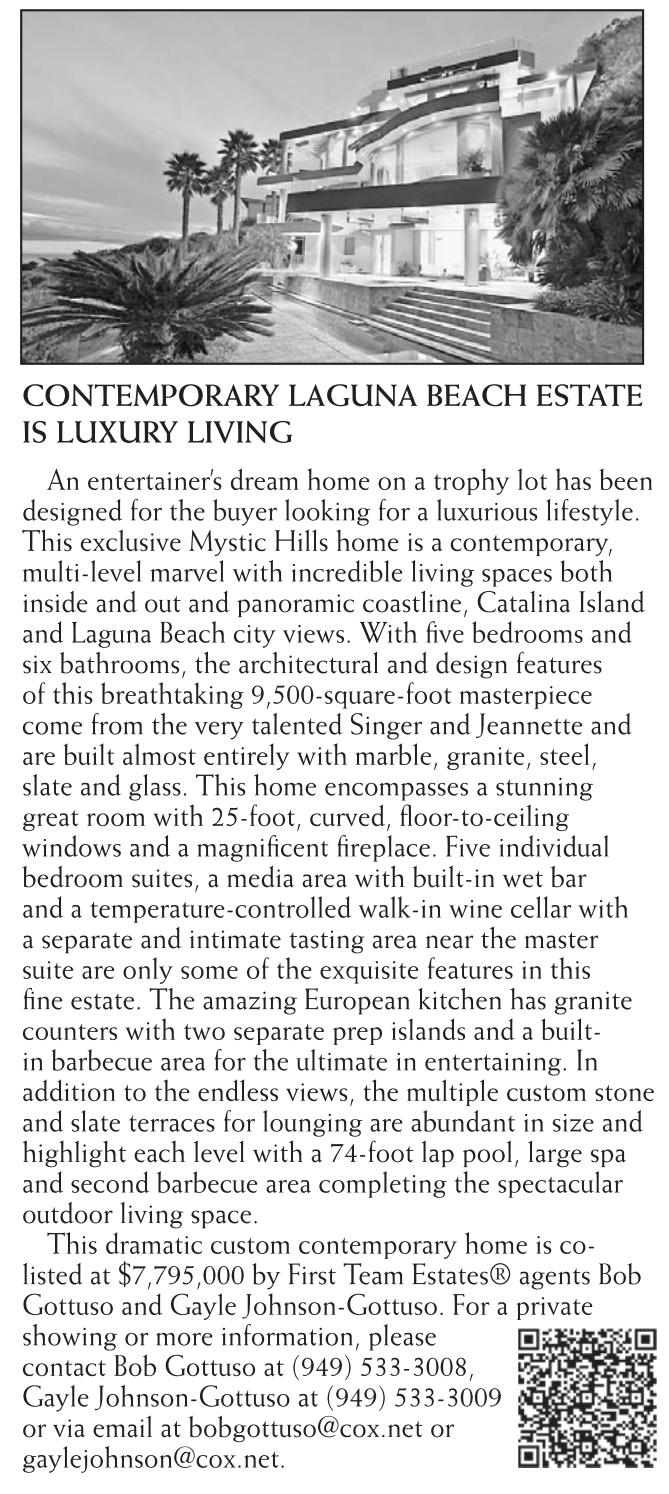 CONTEMPORARY LAGUNA BEACH ESTATE IS LUXURY LIVING An entertainer’s dream home on a trophy lot has been designed for the buyer looking for a luxurious lifestyle. This exclusive Mystic Hills home is a contemporary, multi-level marvel with incredible living spaces both inside and out and panoramic coastline, Catalina Island and Laguna Beach city views. With fi ve bedrooms and six bathrooms, the architectural and design features of this breathtaking 9,500-square-foot masterpiece come from the very talented Singer and Jeannette and are built almost entirely with marble, granite, steel, slate and glass. This home encompasses a stunning great room with 25-foot, curved, fl oor-to-ceiling windows and a magnifi cent fi replace. Five individual bedroom suites, a media area with built-in wet bar and a temperature-controlled walk-in wine cellar with a separate and intimate tasting area near the master suite are only some of the exquisite features in this fi ne estate. The amazing European kitchen has granite counters with two separate prep islands and a builtin barbecue area for the ultimate in entertaining. In addition to the endless views, the multiple custom stone and slate terraces for lounging are abundant in size and highlight each level with a 74-foot lap pool, large spa and second barbecue area completing the spectacular outdoor living space. This dramatic custom contemporary home is colisted at $7,795,000 by First Team Estates® agents Bob Gottuso and Gayle Johnson-Gottuso. For a private showing or more information, please contact Bob Gottuso at (949) 533-3008, Gayle Johnson-Gottuso at (949) 533-3009 or via email at bobgottuso@cox.net or gaylejohnson@cox.net.