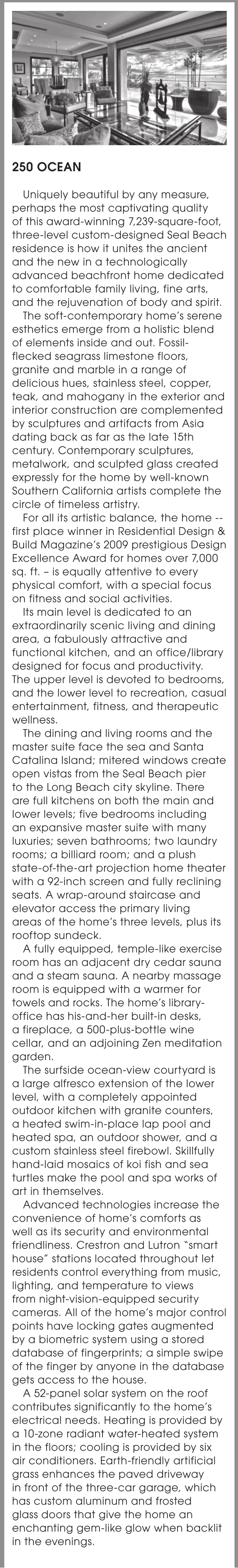 Uniquely beautiful by any measure, perhaps the most captivating quality of this award-winning 7,239-square-foot, three-level custom-designed Seal Beach residence is how it unites the ancient and the new in a technologically advanced beachfront home dedicated to comfortable family living, fine arts, and the rejuvenation of body and spirit.
