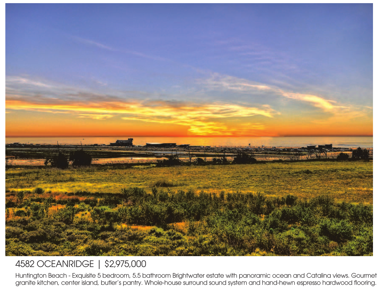 4582 OCEANRIDGE | $2,975,000 Huntington Beach - Exquisite 5 bedroom, 5.5 bathroom Brightwater estate with panoramic ocean and Catalina views. Gourmet granite kitchen, center island, butler’s pantry. Whole-house surround sound system and hand-hewn espresso hardwood flooring.