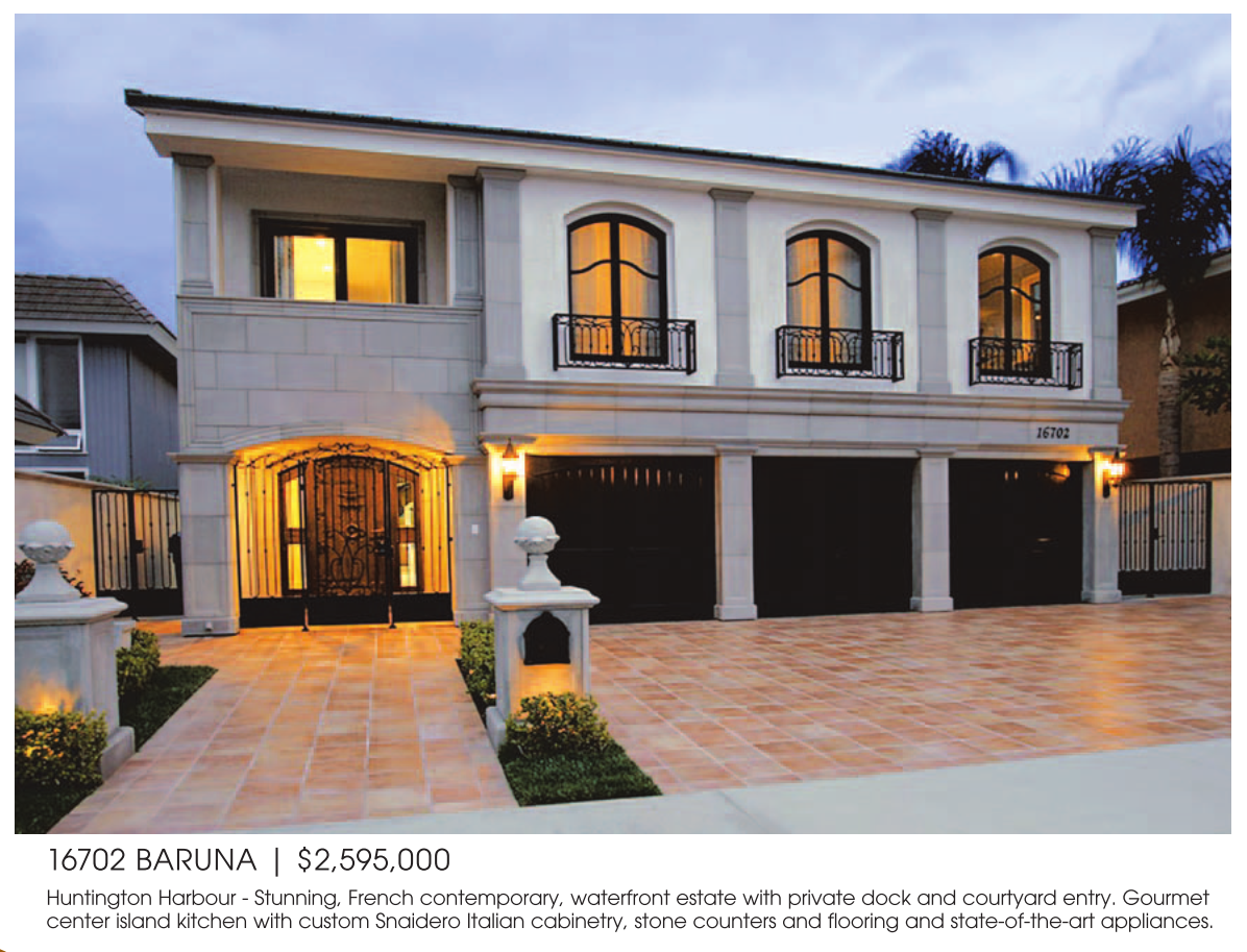 16702 BARUNA | $2,595,000 Huntington Harbour - Stunning, French contemporary, waterfront estate with private dock and courtyard entry. Gourmet center island kitchen with custom Snaidero Italian cabinetry, stone counters and flooring and state-of-the-art appliances.