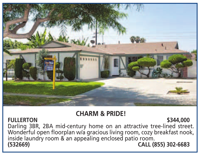 CHARM & PRIDE! FULLERTON $344,000 Darling 3BR, 2BA mid-century home on an attractive tree-lined street. Wonderful open floorplan w/a gracious living room, cozy breakfast nook, inside laundry room & an appealing enclosed patio room. (532669) CALL (855) 302-6683