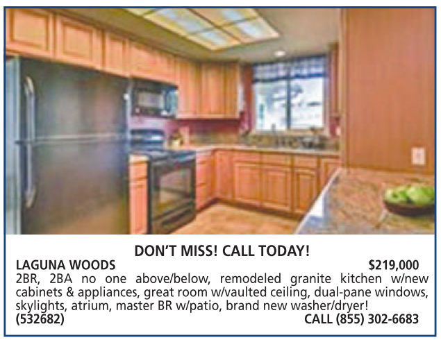 DON’T MISS! CALL TODAY! LAGUNA WOODS $219,000 2BR, 2BA no one above/below, remodeled granite kitchen w/new cabinets & appliances, great room w/vaulted ceiling, dual-pane windows, skylights, atrium, master BR w/patio, brand new washer/dryer! (532682) CALL (855) 302-6683