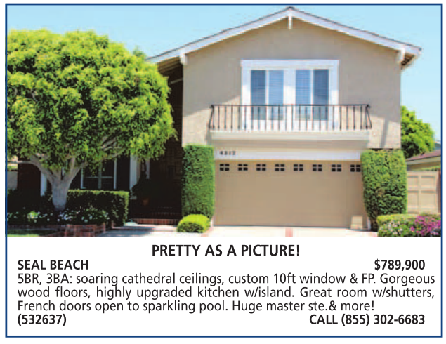 PRETTY AS A PICTURE! SEAL BEACH $789,900 5BR, 3BA: soaring cathedral ceilings, custom 10ft window & FP. Gorgeous wood floors, highly upgraded kitchen w/island. Great room w/shutters, French doors open to sparkling pool. Huge master ste.& more! (532637) CALL (855) 302-6683
