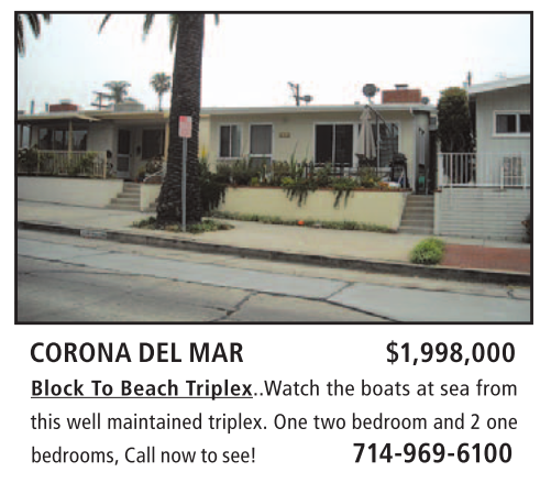 CORONA DEL MAR $1,998,000 Block To Beach Triplex..Watch the boats at sea from this well maintained triplex. One two bedroom and 2 one bedrooms, Call now to see! 714-969-6100