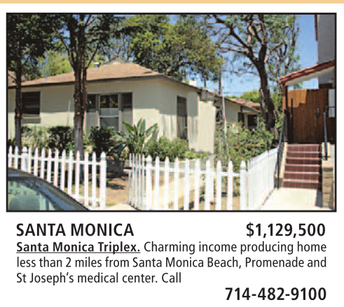 SANTA MONICA $1,129,500 Santa Monica Triplex. Charming income producing home less than 2 miles from Santa Monica Beach, Promenade and St Joseph’s medical center. Call 714-482-9100