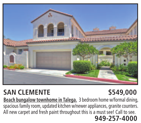 SAN CLEMENTE $549,000 Beach bungalow townhome in Talega. 3 bedroom home w/formal dining, spacious family room, updated kitchen w/newer appliances, granite counters. All new carpet and fresh paint throughout this is a must see! Call to see. 949-257-4000