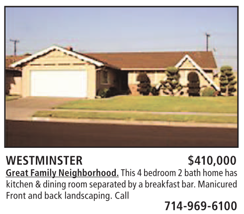 WESTMINSTER $410,000 Great Family Neighborhood. This 4 bedroom 2 bath home has kitchen & dining room separated by a breakfast bar. Manicured Front and back landscaping. Call 714-969-6100