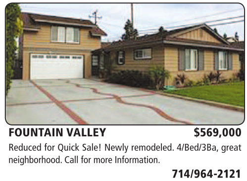 FOUNTAIN VALLEY $569,000 Reduced for Quick Sale! Newly remodeled. 4/Bed/3Ba, great neighborhood. Call for more Information.