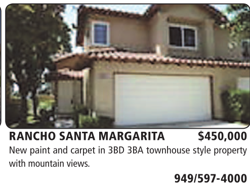 RANCHO SANTA MARGARITA $450,000 New paint and carpet in 3BD 3BA townhouse style property with mountain views.
