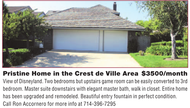 Pristine Home in the Crest de Ville Area $3500/month View of Disneyland. Two bedrooms but upstairs game room can be easily converted to 3rd bedroom. Master suite downstairs with elegant master bath, walk in closet. Entire home has been upgraded and remodeled. Beautiful entry fountain in perfect condition. Call Ron Accornero for more info at 714-396-7295