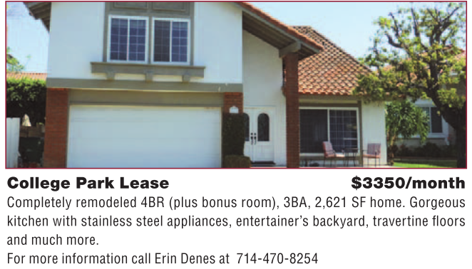College Park Lease $3350/month Completely remodeled 4BR (plus bonus room), 3BA, 2,621 SF home. Gorgeous kitchen with stainless steel appliances, entertainer’s backyard, travertine fl oors and much more. For more information call Erin Denes at 714-470-8254