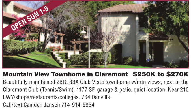 Mountain View Townhome in Claremont $250K to $270K Beautifully maintained 2BR, 3BA Club Vista townhome w/mtn views, next to the Claremont Club (Tennis/Swim). 1177 SF, garage & patio, quiet location. Near 210 FWY/shops/restaurants/colleges. 764 Danville. Call/text Camden Jansen 714-914-5954