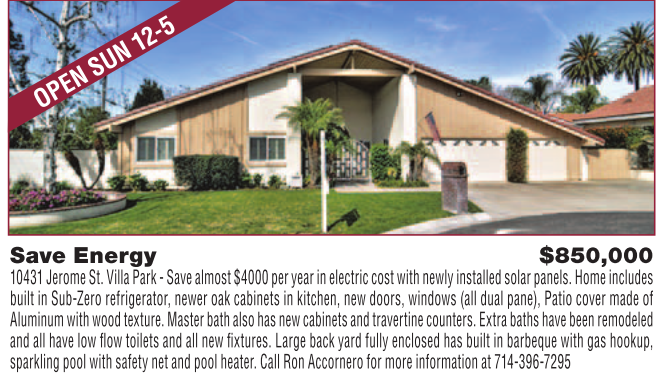 and all have low fl ow toilets and all new fi xtures. Large back yard fully enclosed has built in barbeque with gas hookup, sparkling pool with safety net and pool heater. Call Ron Accornero for more information at 714-396-7295