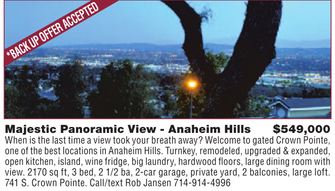 Majestic Panoramic View - Anaheim Hills $549,000 When is the last time a view took your breath away? Welcome to gated Crown Pointe, one of the best locations in Anaheim Hills. Turnkey, remodeled, upgraded & expanded, open kitchen, island, wine fridge, big laundry, hardwood floors, large dining room with view. 2170 sq ft, 3 bed, 2 1/2 ba, 2-car garage, private yard, 2 balconies, large loft. 741 S. Crown Pointe. Call/text Rob Jansen 714-914-4996