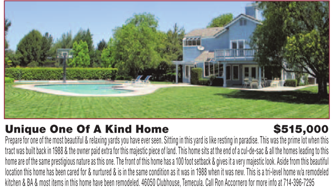 Unique One Of A Kind Home $515,000 Prepare for one of the most beautiful & relaxing yards you have ever seen. Sitting in this yard is like resting in paradise. This was the prime lot when this tract was built back in 1988 & the owner paid extra for this majestic piece of land. This home sits at the end of a cul-de-sac & all the homes leading to this home are of the same prestigious nature as this one. The front of this home has a 100 foot setback & gives it a very majestic look. Aside from this beautiful location this home has been cared for & nurtured & is in the same condition as it was in 1988 when it was new. This is a tri-level home w/a remodeled kitchen & BA & most items in this home have been remodeled. 46050 Clubhouse, Temecula. Call Ron Accornero for more info at 714-396-7295