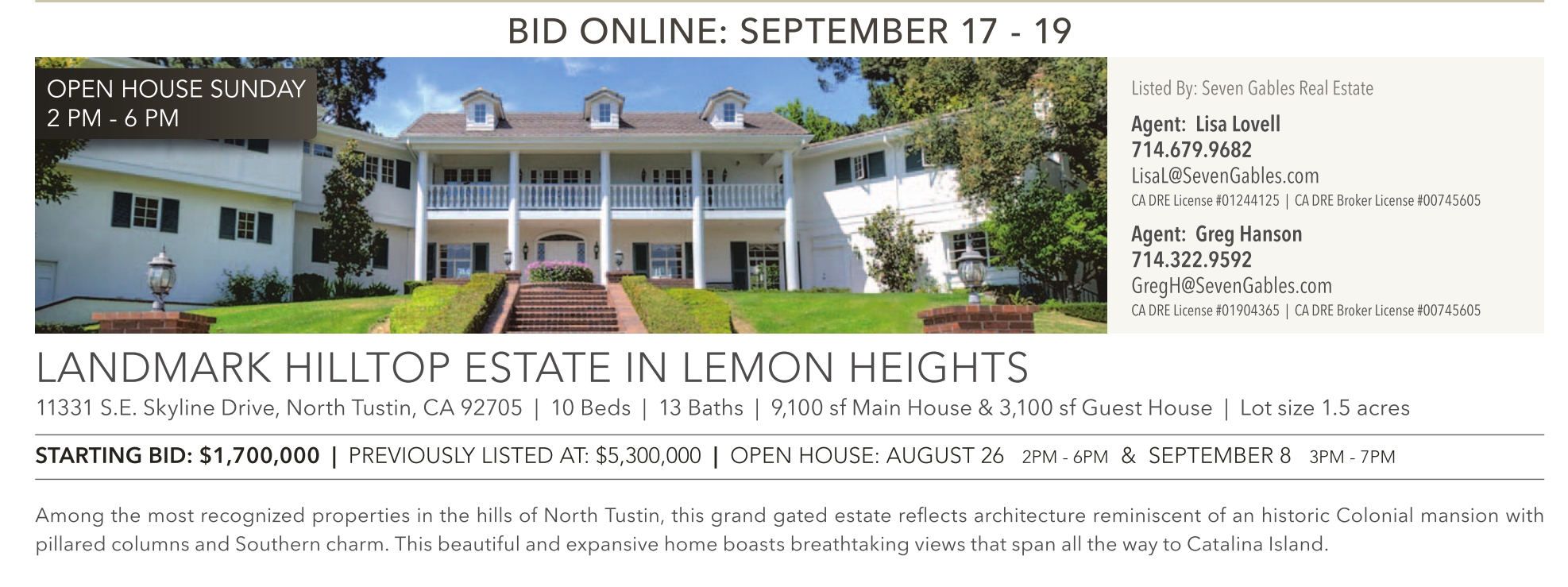 11331 S.E. Skyline Drive, North Tustin, CA 92705 | 10 Beds | 13 Baths | 9,100 sf Main House & 3,100 sf Guest House | Lot size 1.5 acres