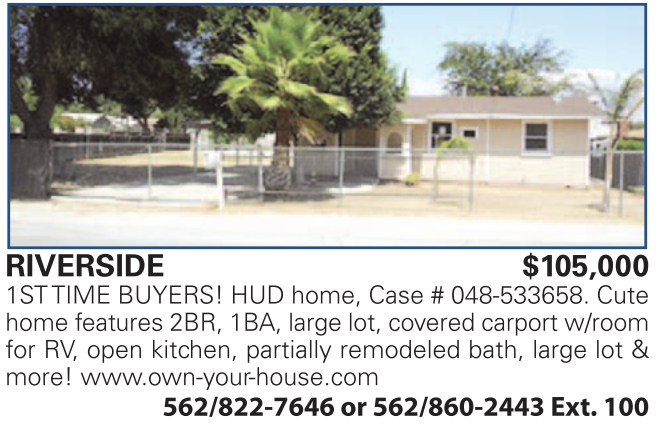 RIVERSIDE $105,000 1ST TIME BUYERS! HUD home, Case # 048-533658. Cute home features 2BR, 1BA, large lot, covered carport w/room for RV, open kitchen, partially remodeled bath, large lot & more! www.own-your-house.com 562/822-7646 or 562/860-2443 Ext. 100