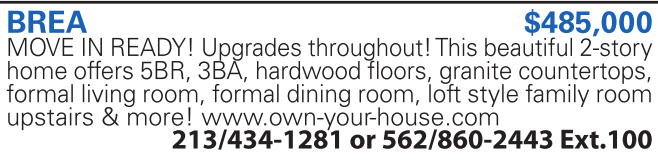 BREA $485,000 MOVE IN READY! Upgrades throughout! This beautiful 2-story home offers 5BR, 3BA, hardwood floors, granite countertops, formal living room, formal dining room, loft style family room upstairs & more! www.own-your-house.com 213/434-1281 or 562/860-2443 Ext.100