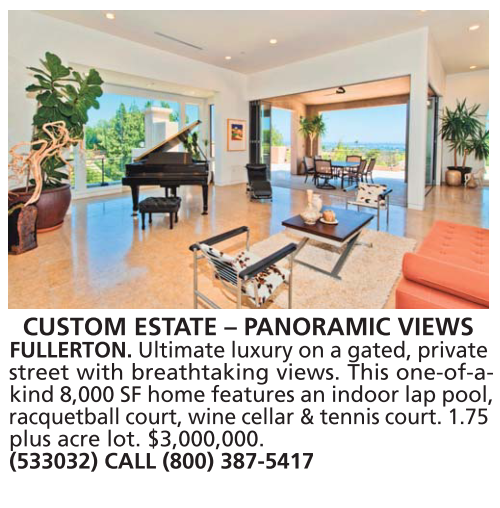 CUSTOM ESTATE – PANORAMIC VIEWS FULLERTON. Ultimate luxury on a gated, private street with breathtaking views. This one-of-akind 8,000 SF home features an indoor lap pool, racquetball court, wine cellar & tennis court. 1.75 plus acre lot. $3,000,000. (533032) CALL (800) 387-5417