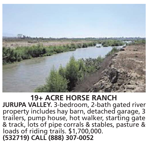 19+ ACRE HORSE RANCH JURUPA VALLEY. 3-bedroom, 2-bath gated river property includes hay barn, detached garage, 3 trailers, pump house, hot walker, starting gate & track, lots of pipe corrals & stables, pasture & loads of riding trails. $1,700,000. (532719) CALL (888) 307-0052