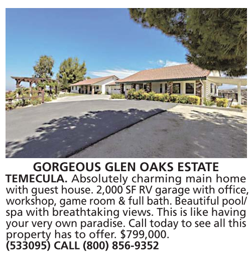 barn, GORGEOUS GLEN OAKS ESTATE TEMECULA. Absolutely charming main home with guest house. 2,000 SF RV garage with office, workshop, game room & full bath. Beautiful pool/ spa with breathtaking views. This is like having your very own paradise. Call today to see all this property has to offer. $799,000. (533095) CALL (800) 856-9352