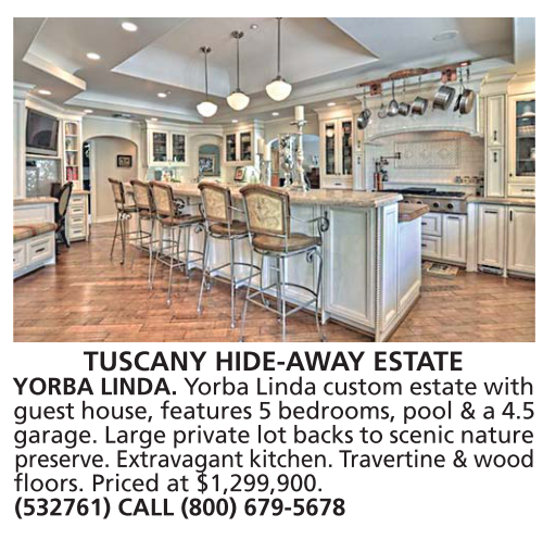 TUSCANY HIDE-AWAY ESTATE YORBA LINDA. Yorba Linda custom estate with guest house, features 5 bedrooms, pool & a 4.5 garage. Large private lot backs to scenic nature preserve. Extravagant kitchen. Travertine & wood floors. Priced at $1,299,900. (532761) CALL (800) 679-5678