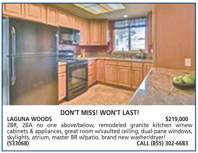 DON’T MISS! WON’T LAST! LAGUNA WOODS $219,000 2BR, 2BA no one above/below, remodeled granite kitchen w/new cabinets & appliances, great room w/vaulted ceiling, dual-pane windows, skylights, atrium, master BR w/patio, brand new washer/dryer! (533068) CALL (855) 302-6683