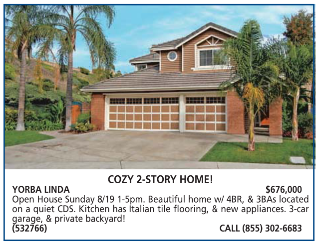 YORBA LINDA $676,000 Open House Sunday 8/19 1-5pm. Beautiful home w/ 4BR, & 3BAs located on a quiet CDS. Kitchen has Italian tile flooring, & new appliances. 3-car garage, & private backyard! (532766) CALL (855) 302-6683