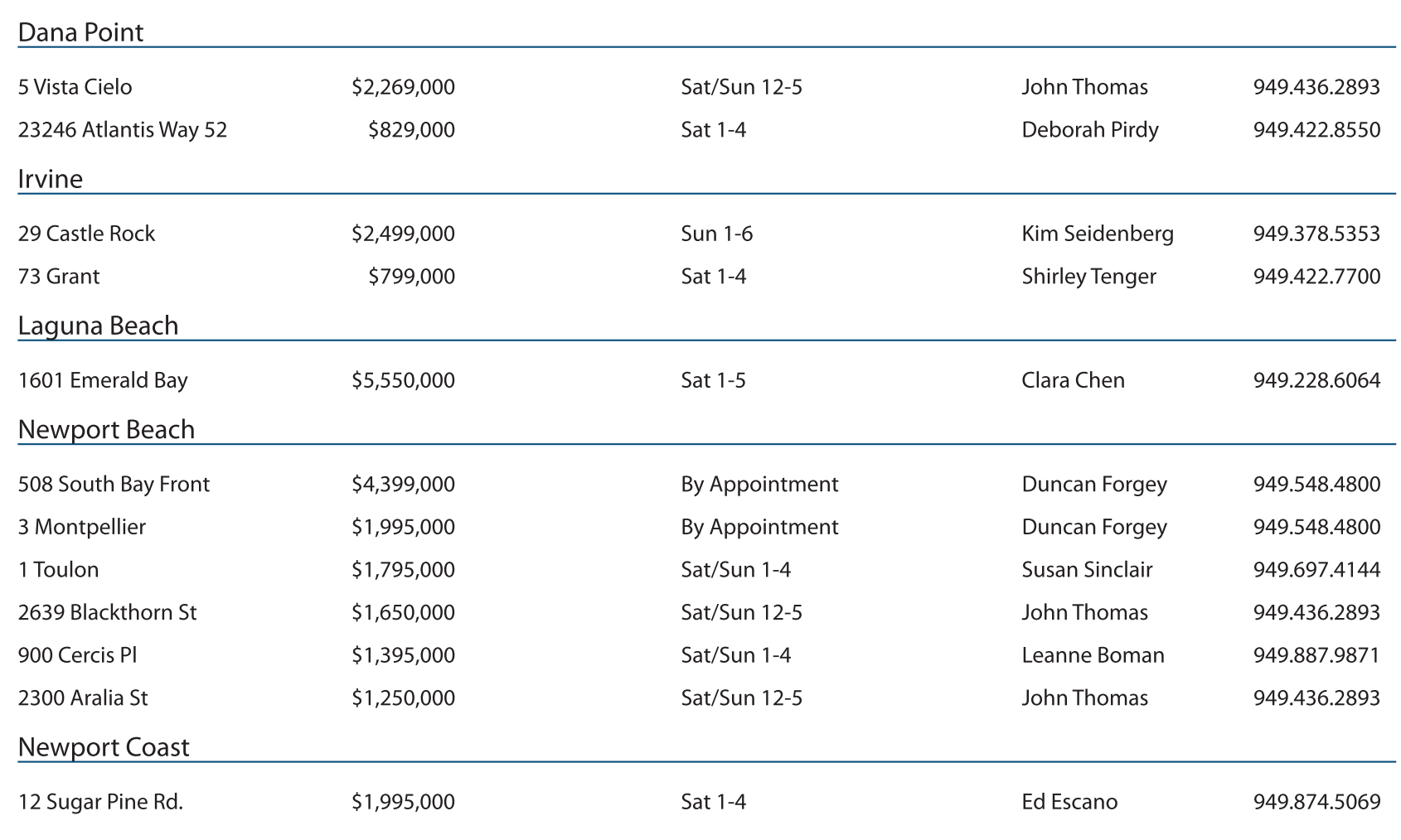 5 Vista Cielo $2,269,000 Sat/Sun 12-5 John Thomas 949.436.2893 23246 Atlantis Way 52 $829,000 Sat 1-4 Deborah Pirdy 949.422.8550 Irvine 29 Castle Rock $2,499,000 Sun 1-6 Kim Seidenberg 949.378.5353 73 Grant $799,000 Sat 1-4 Shirley Tenger 949.422.7700 Laguna Beach 1601 Emerald Bay $5,550,000 Sat 1-5 Clara Chen 949.228.6064 Newport Beach 508 South Bay Front $4,399,000 By Appointment Duncan Forgey 949.548.4800 3 Montpellier $1,995,000 By Appointment Duncan Forgey 949.548.4800 1 Toulon $1,795,000 Sat/Sun 1-4 Susan Sinclair 949.697.4144 2639 Blackthorn St $1,650,000 Sat/Sun 12-5 John Thomas 949.436.2893 900 Cercis Pl $1,395,000 Sat/Sun 1-4 Leanne Boman 949.887.9871 2300 Aralia St $1,250,000 Sat/Sun 12-5 John Thomas 949.436.2893 Newport Coast 12 Sugar Pine Rd. $1,995,000 Sat 1-4 Ed Escano 949.874.5069