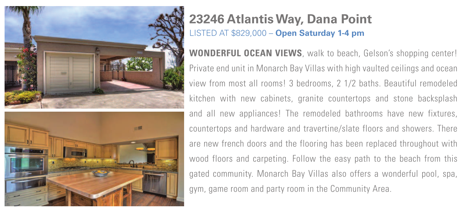 23246 Atlantis Way, Dana Point LISTED AT $829,000 – Open Saturday 1-4 pm WONDERFUL OCEAN VIEWS, walk to beach, Gelson’s shopping center! Private end unit in Monarch Bay Villas with high vaulted ceilings and ocean view from most all rooms! 3 bedrooms, 2 1/2 baths. Beautiful remodeled kitchen with new cabinets, granite countertops and stone backsplash and all new appliances! The remodeled bathrooms have new fixtures, countertops and hardware and travertine/slate floors and showers. There are new french doors and the flooring has been replaced throughout with wood floors and carpeting. Follow the easy path to the beach from this gated community. Monarch Bay Villas also offers a wonderful pool, spa, gym, game room and party room in the Community Area.
