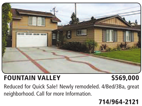 FOUNTAIN VALLEY $569,000 Reduced for Quick Sale! Newly remodeled. 4/Bed/3Ba, great neighborhood. Call for more Information.
