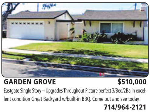 GARDEN GROVE $510,000 Eastgate Single Story – Upgrades Throughout Picture perfect 3/Bed/2Ba in excellent condition Great Backyard w/built-in BBQ. Come out and see today!