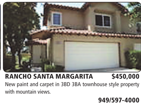 RANCHO SANTA MARGARITA $450,000 New paint and carpet in 3BD 3BA townhouse style property with mountain views.