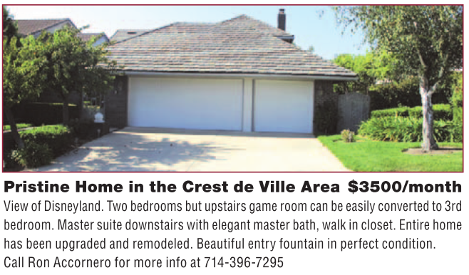 Pristine Home in the Crest de Ville Area $3500/month View of Disneyland. Two bedrooms but upstairs game room can be easily converted to 3rd bedroom. Master suite downstairs with elegant master bath, walk in closet. Entire home has been upgraded and remodeled. Beautiful entry fountain in perfect condition. Call Ron Accornero for more info at 714-396-7295