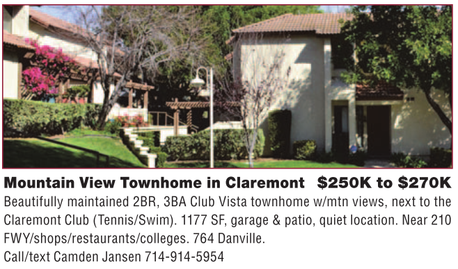 Mountain View Townhome in Claremont $250K to $270K Beautifully maintained 2BR, 3BA Club Vista townhome w/mtn views, next to the Claremont Club (Tennis/Swim). 1177 SF, garage & patio, quiet location. Near 210 FWY/shops/restaurants/colleges. 764 Danville. Call/text Camden Jansen 714-914-5954