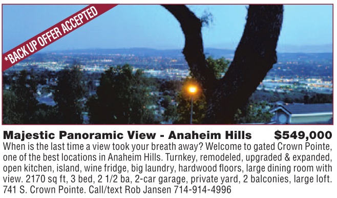Majestic Panoramic View - Anaheim Hills $549,000 When is the last time a view took your breath away? Welcome to gated Crown Pointe, one of the best locations in Anaheim Hills. Turnkey, remodeled, upgraded & expanded, open kitchen, island, wine fridge, big laundry, hardwood floors, large dining room with view. 2170 sq ft, 3 bed, 2 1/2 ba, 2-car garage, private yard, 2 balconies, large loft. 741 S. Crown Pointe. Call/text Rob Jansen 714-914-4996