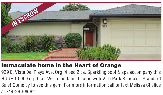 Immaculate home in the Heart of Orange 929 E. Vista Del Playa Ave, Org. 4 bed 2 ba. Sparkling pool & spa accompany this HUGE 10,000 sq ft lot. Well maintained home with Villa Park Schools - Standard Sale! Come by to see this gem. For more information call or text Melissa Chelius at 714-299-8062
