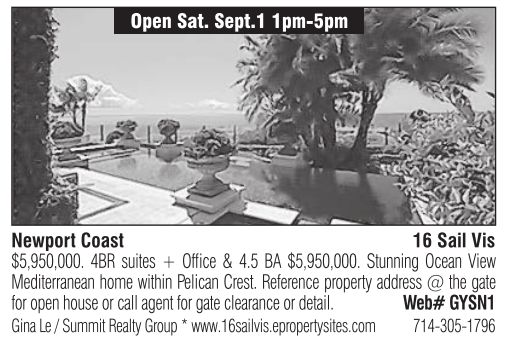 Open Sat. Sept.1 1pm-5pm Newport Coast 16 Sail Vis $5,950,000. 4BR suites + Office & 4.5 BA $5,950,000. Stunning Ocean View Mediterranean home within Pelican Crest. Reference property address @ the gate for open house or call agent for gate clearance or detail. Web# GYSN1 Gina Le / Summit Realty Group * www.16sailvis.epropertysites.com 714-305-1796