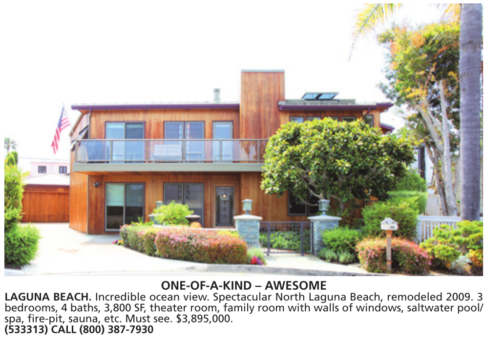 ONE-OF-A-KIND – AWESOME LAGUNA BEACH. Incredible ocean view. Spectacular North Laguna Beach, remodeled 2009. 3 bedrooms, 4 baths, 3,800 SF, theater room, family room with walls of windows, saltwater pool/ spa, fire-pit, sauna, etc. Must see. $3,895,000. (533313) CALL (800) 387-7930