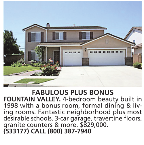 FABULOUS PLUS BONUS FOUNTAIN VALLEY. 4-bedroom beauty built in 1998 with a bonus room, formal dining & living rooms. Fantastic neighborhood plus most desirable schools, 3-car garage, travertine floors, granite counters & more. $829,000. (533177) CALL (800) 387-7940