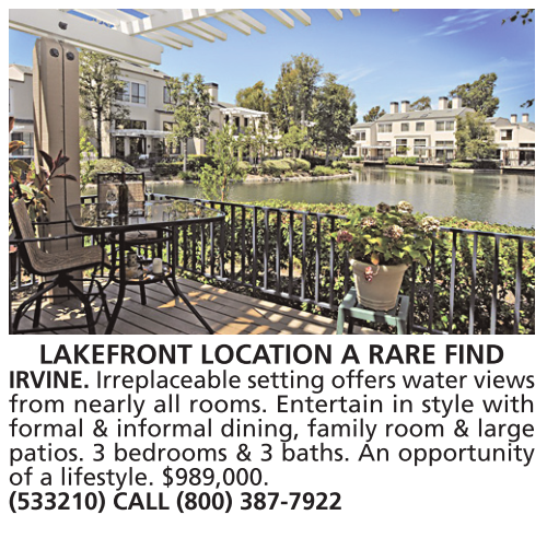 LAKEFRONT LOCATION A RARE FIND IRVINE. Irreplaceable setting offers water views from nearly all rooms. Entertain in style with formal & informal dining, family room & large patios. 3 bedrooms & 3 baths. An opportunity of a lifestyle. $989,000. (533210) CALL (800) 387-7922