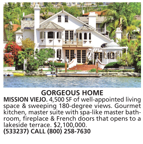 GORGEOUS HOME MISSION VIEJO. 4,500 SF of well-appointed living space & sweeping 180-degree views. Gourmet kitchen, master suite with spa-like master bathroom, fireplace & French doors that opens to a lakeside terrace. $2,100,000. (533237) CALL (800) 258-7630
